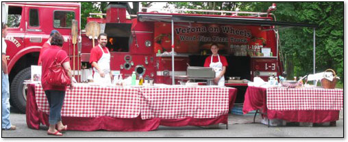 Pizza Catering at its best! Our Red Fire Truck has it's own power, so it can serve hot pizza anywhere: